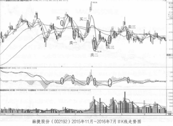 如图所示,融捷股份( 002192 )和览海投资的走势截然不同,融捷股份处于窄幅的调整期,此时作为趋势型指标的MACD指标可以说是完全失灵,下图中的三次操作机会是按照MACD指标金叉进场、死叉离场的要求进行的,可以很直观地看出在横盘状态下用MACD指标操作的失败程度。