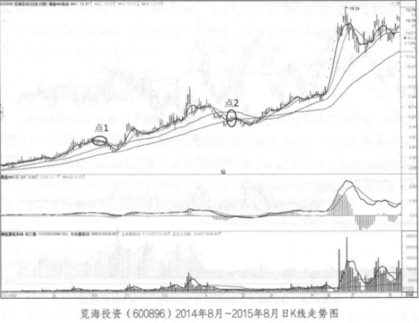 如图所示,览海投资( 600896)的整个上升趋势都属于5178点牛市的黄金时期,如果是价值投资派做长线投资坚持持仓,整体的收益是非常可观的,但是如果用MACD指标的死叉或者零轴上柱体缩短找卖点就会导在下图的点1和点2位置提前离场。