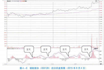 如图4-6所示,2015 年8月4日盘中,银轮股份(002126) 的MACD指标多次形成了0轴附近的MACD金叉形态。每一个MACD金叉出现后,股价都会开始一轮持续上涨的行情。利用盘中的这些金叉机会,投资者可以进行日内的超短线操作。