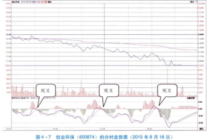 如图4-7所示,2015年8月18日盘中,创业环保( 600874)的MACD指标多次在0轴附近形成MACD死叉形态。每一次0轴附近MACD死叉完成后,股价都会开始轮持续下跌行情。投资者可以抓住这样的盘中下跌机会,进行超短线操作。
