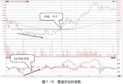 如图7-15所示,2015 年8月4日上午,爱迪尔(002740) 股价下跌至底部后,连续两次几乎下跌至同一个位置获得支撑,形成双底形态。在双底的第一个底部,股价就已经与MACD指标中的DIF线形成了背离形态。
