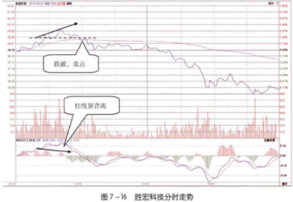 同样的道理,当分时线形成双顶、三重顶、头肩顶等顶部反转信号时,如果分时MACD指标也形成了顶背离形态,则该信号的看跌信号会更加可靠。看到股价跌破颈线时,投资者应该果断地卖出股票。