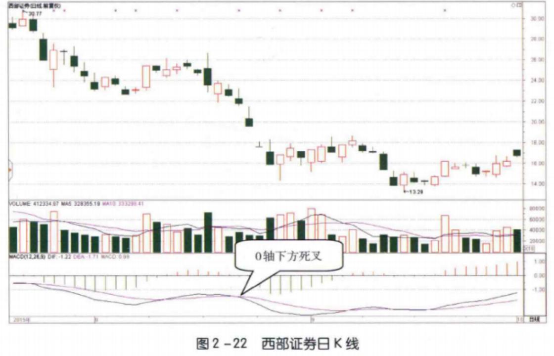 如图2-22所示,2015年8月21日,西部证券(002673) 经过下跌后的反弹,其MACD指标在低位形成了死叉形态。这样的形态说明反弹结束,股价的下跌速度再次加快,未来将会持续下跌。看到这样的形态后,投资者应该尽快卖出手中的股票。