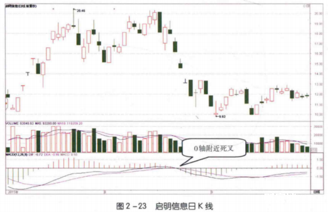 如图2-23所示,2015 年8月21日,启明信息(002232) MACD 指标的两条曲线在0轴附近区域形成了死叉形态。这样的形态是非常强势的看跌卖出信号,预示着该股未来将会持续下跌,并且下跌的速度会越来越快。看到这个信号后,投资者应该尽快卖出手中的股票,回避随后的下跌风险。
