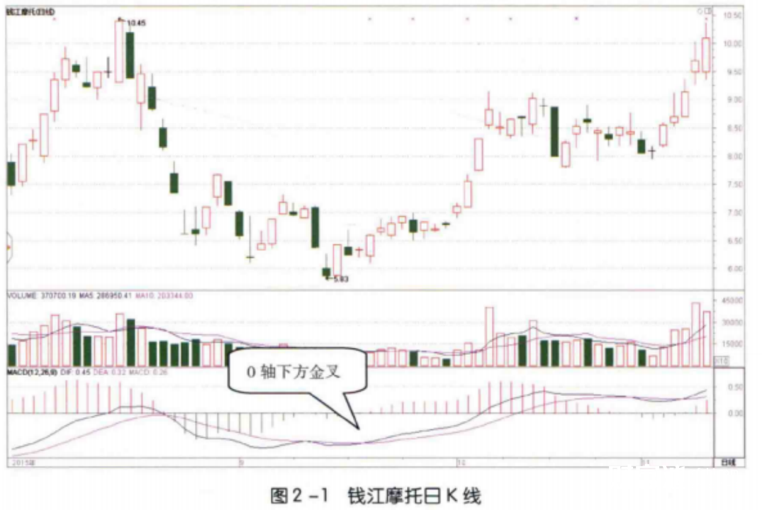 如图2-1所示,2015 年9月21日,钱江摩托(000913) MACD 指标的DIF线在0轴下方,自下向上突破DEA线,形成金叉形态。这样的形态说明股价短期内的下跌速度越来越弱,有在底部获得支撑开始反弹的趋势。看到这样的形态后,投资者可以积极买入股票。