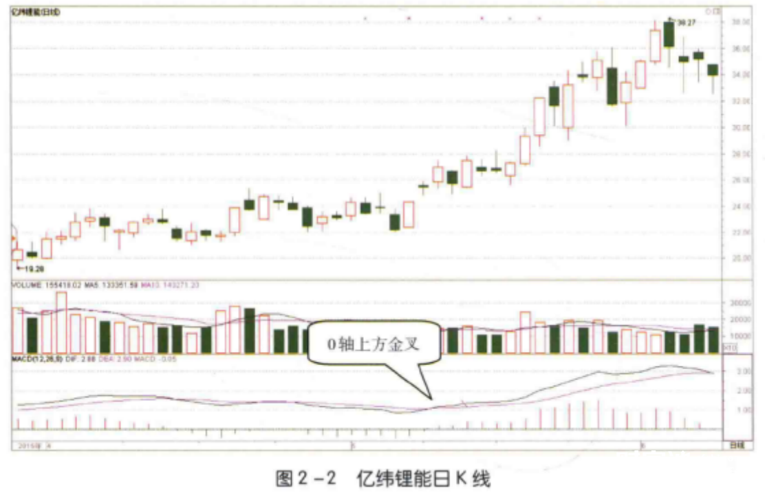 如图2-2所示,2015 年5月12日,亿纬锂能(300014) 股价持续上涨过程中,其MACD指标的DIF线突破DEA线,形成金叉。这样的金叉出现在0轴上方,说明此时该股已经处于上涨趋势中,并且未来的上涨速度会越来越快。看到这样的形态,投资者可以积极买入股票。