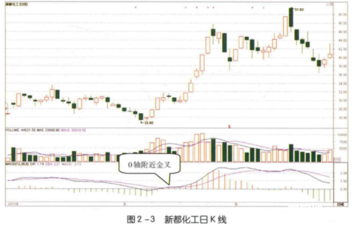 如图2-3所示,2015年5月14日,新都化工(002539) 经过一段高位回落走势后重新上涨,同时其MACD指标的两条曲线回落到0轴附近完成了金叉形态。这样的形态说明此时该股股价已经调整到位,未来将进入上涨趋势中,并且上涨速度会越来越快。这是一个非常强的看涨买入信号。看到这样的信号,投资者可以积极买入股票。