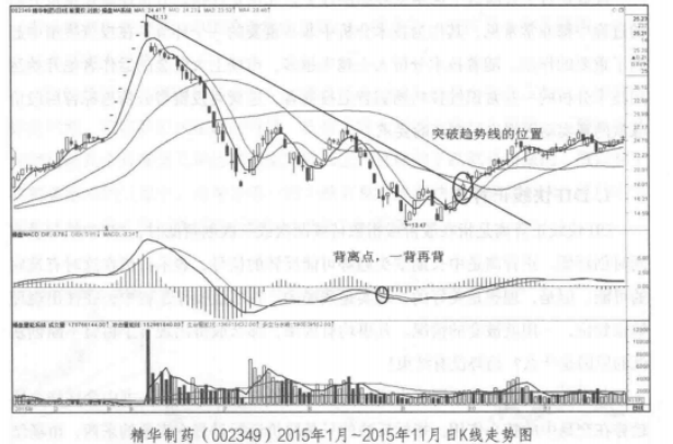 从下图的背离点上可以看出,在最后的一个下跌波段,股价持续创新低,DIF线始终处于背离状态,按照“正背离后出现买点”的理论,进场就会被套。此时股价还在下跌趋势中,指标只是反映出了当下波段上涨或者下跌动能的状态,并不能反映趋势是否终结,只有在股价突破了原来的下降趋势线时,才能确定股价暂时进人了阶段性底部阶段,后期方向如何选择还待观察。