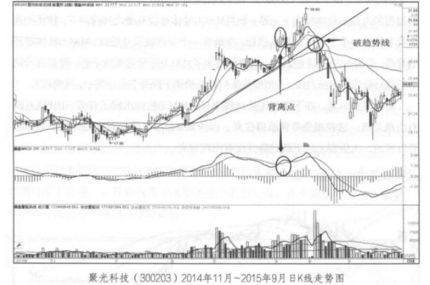 如图所示,在聚光科技( 300203)的上升趋势中,随着上升趋势的运行,上涨的动能从缓慢上涨到加速上涨后面临一次横盘调整,之后股价再次创新高,但是很明显DIF线很难再创新高,即使在最后连续上涨的行情中,DIF线也没有超过前一个上涨波段的高点。但是,此时只能作为一个风险即将来临的信号,而非真正离场的信号,真正的离场位一定是在破小周期趋势线的位置。