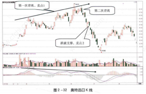 在股价持续上涨的过程中,如果MACD指标红色柱线形成与股价相反的走势,二者就形成了顶背离形态。