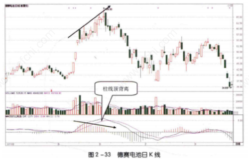 如图2-33所示,2015年5月底至6月初,德赛电池(000049)股价在高位上涨过程中不断创出新高,同时其MACD指标的红色柱线却越来越短,二者组成顶背离形态。这样的形态说明虽然股价在持续上涨,但是推动其上涨的内在动能越来越弱,形成看跌卖出信号。看到这样的形态,投资者应该注意逢高卖出手中的股票。
