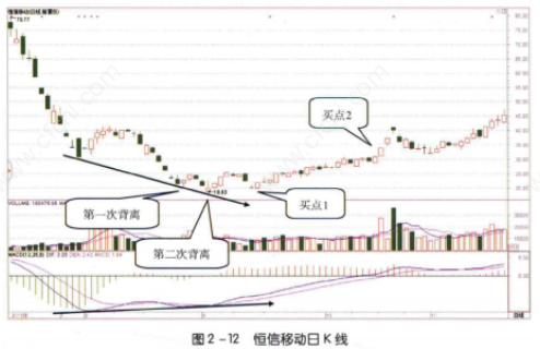 MACD指标的柱线可以表现股价运行的加速度,也就是推动股价涨跌能量的强弱。如果股价运行方向与MACD指标柱线变动方向相反,二者就形成了底背离的形态。