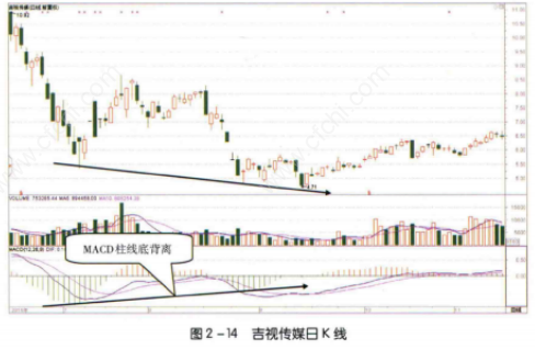 如图2-14所示,2015年7月至9月,吉视传媒( 601929)下跌至底部创出新低后,其MACD指标的绿色柱线却比上次下跌时更短,二者形成底背离形态。