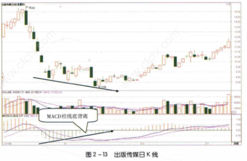 如图2-13所示,2015年8月底至9月,出版传媒(601999) 股价持续下跌并创出新低的同时,其MACD指标的绿色柱线出现了逐渐变短的趋势,二者形成底背离形态。这样的形态说明虽然股价持续下跌,但是打压股价下跌的能量越来越弱,未来将会见底反弹。看到这个信号,投资者可以考虑抄底买入股票。