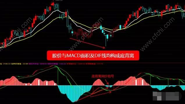 底背离一般出现在股价的低位区。当股价K线图上的股票走势,股价还在下跌,而MACD指标图形上的由绿柱构成的图形的走势是一底比一底高,即当股价的低点比前一次低点底,而指标的低点却比前一次的低点高,这叫底背离现象。