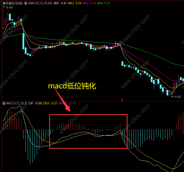 macd指标低位钝化表现:DIFF双线向下运行过程中,当向下达到区域下沿极限区域后,DIFF线因显示的原因无法再继续向下运行,于是沿区域下沿极限水平运行。DIFF线低位钝化是一种短线超卖的表现,但并不- - -定意味着股价会由此止跌回升,必须结合其他MACD指标综合判断。不过这是判断趋势反转与买点的重要依据,因此应当看懂DIFF线低位钝化形态。如图: