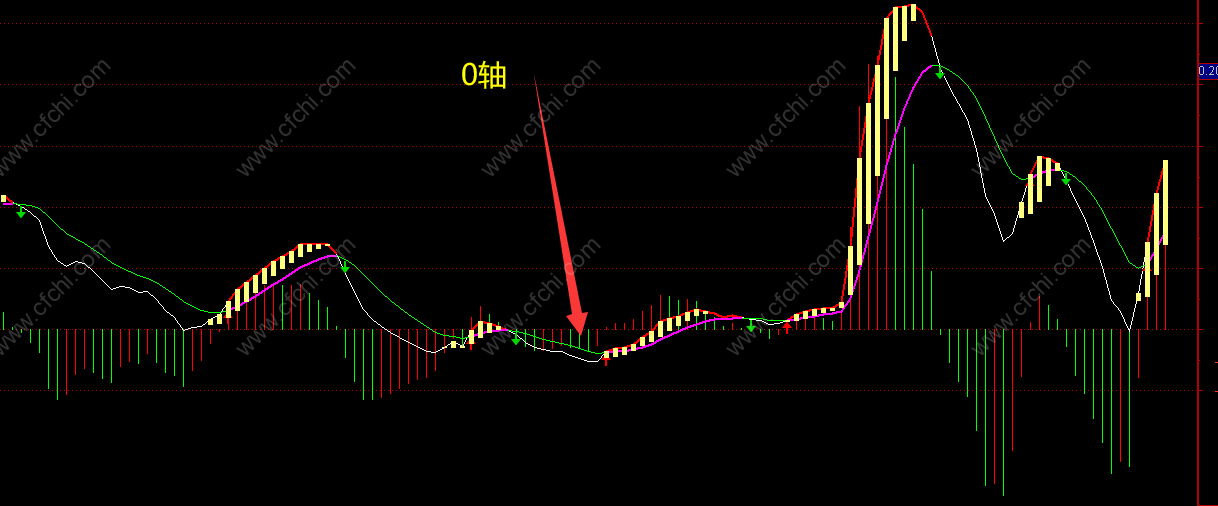 2、判断上涨趋势时,关键是要确认0轴的位置,即红柱与绿柱之间的那条水平线,0轴并不是MACD指标显示区域的那条中分虚线。