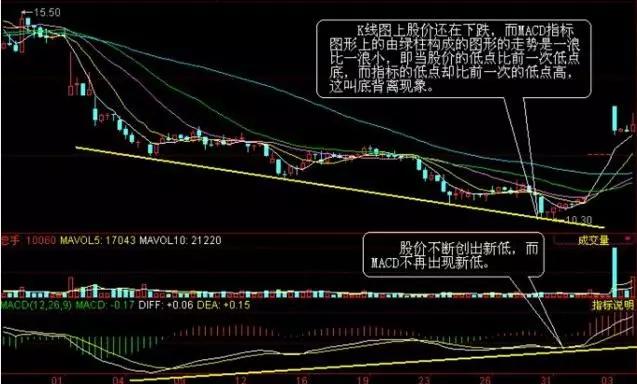 底背离一般出现在股价的低位区。K线图上股价还在下跌,而MACD指标图形上的由绿柱构成的图形的走势是一浪比一浪小,即当股价的低点比前一次低点底,而指标的低点却比前一次的低点高,这叫底背离现象。底背离现象一般是预示股价在低位可能反转向上的信号,表明股价短期内可能反弹向上,是短期买入股票的信号。(如下图)