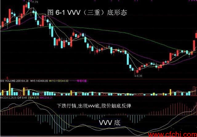 在O轴线下,股价下跌行情中,白线处于某一低点后向上,随后反复上涨下挫,其轨迹上基本在同一水平上形成“VVV底”(三重底)的走势,预示股价上升的趋势,当再次出现“金叉”时,既后(第三)底出现时,可确认为股价反弹,应果断买入。