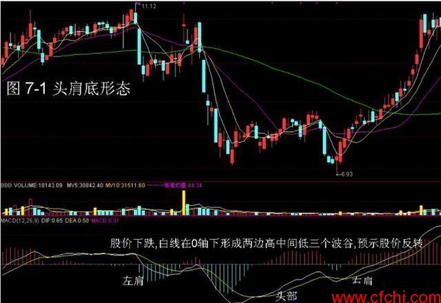 在0轴线下,股价下跌行情中,白线处于低位在盘整过程中,轨迹上形成一个中间底两边高的走势(犹如一个人倒立的头部和肩部),当再次出现“金叉”时,既右(第二)肩出现时,预示股价处于底部将向上反转,也是最佳买入时机。