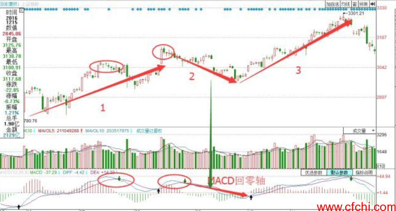 那么调整浪在MACD的表现中,称之为【空中加油】。如下图: