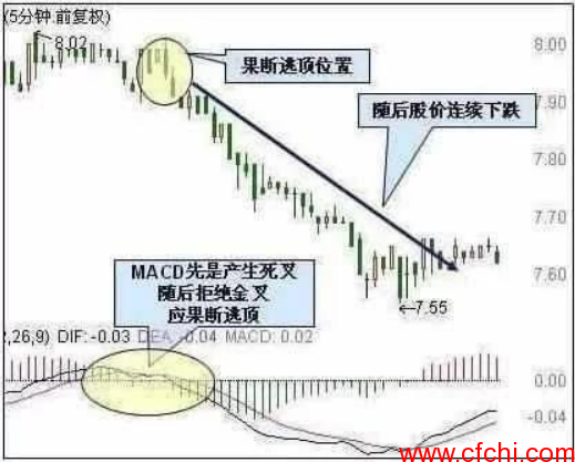 股价自高位下跌,MACD指标产生死叉。然后股价反弹,MACD反转向上,但是股价冲高无力,随即再度掉头下行,MACD指标在快要产生金叉的时候也跟随股价掉头向下。MACD指标拒绝金叉说明股价上涨动能严重不足,短暂的反弹可能是主力维持股价出货,后市可能大幅下跌。