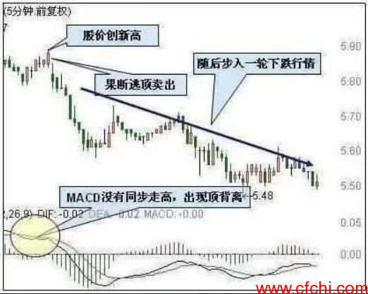 3、5分钟MACD顶背离。股价创新高时,MACD没有创新高,MACD出现顶背离: