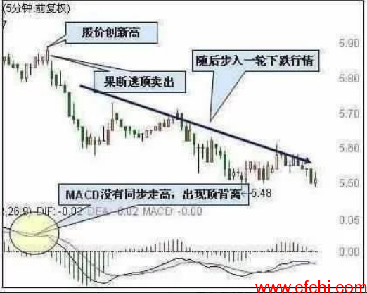 股价在高位反转向下,逐步下跌,MACD也跟随由上而下穿过零轴,这说明股价走势已由涨转跌,很可能马上就要进入下降通道,投资者应及时出逃以规避风险。股价前期涨幅越大,股价随时可能反转向下的可能性越大,5分钟MACD下穿零轴,是当日行情走弱的重要信号。