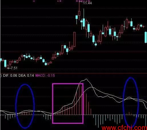 主力无孔不入,假金叉无处不在图中蓝色标记部分都是假金叉。我们可以看到粉色标注的macd红柱不仅数量在稳步递增,而且红柱的长度也在逐渐变高。可以发现,一个真金叉的形成必须有macd红柱的数量与高度的支撑。