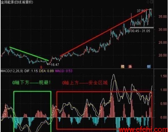 零轴线以上区域的“黄金交叉”,表示价格走势的短期调整结束。