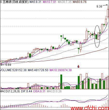 2) DIFF和DEA在0轴附近粘合多头发散:此形态通常是股价从底部经过一段上涨进行强势横盘之后开始向上突破或者是从阶段性顶部经过一段下跌回到60天线附近筑底完成之后形成的,是最具操作价值的形态,通常爆发力和持久力都很强;