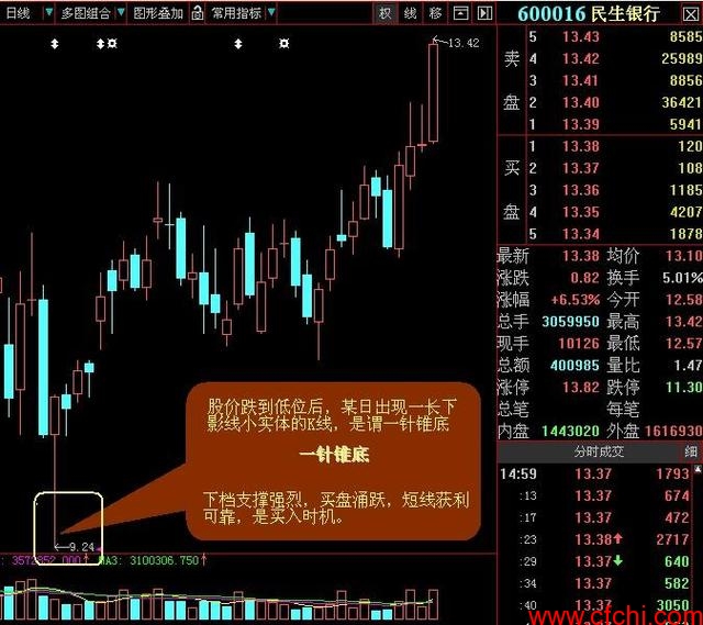 股价在低位,出现一条较长实体的阳K线,将前面多条日K线盖过,表明股价已经获得很强买力,后期股价继续较大幅度上涨的概率很高。