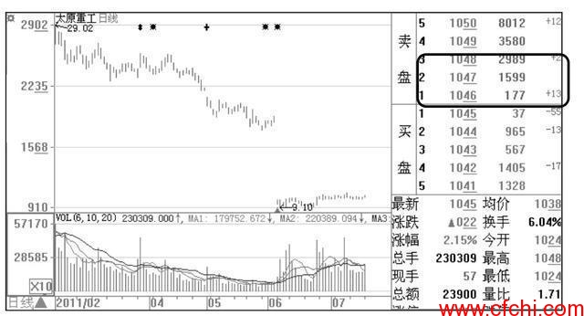 (2)在卖二和卖三处挂上大单,卖一则挂很小的卖单,并且下面挂的买单都很小,然后主力慢慢地把卖一吃掉,随后依次上撤卖单。例如某只股票,在卖二10.47元挂上了1599手,在卖三10.48元挂上了2989手,而在卖一10.46元只挂出了177手的卖单。主力这样操作是为了等卖一处的177手被吃掉后,撤掉卖二处的1599手卖单,改挂卖一处100手10.46的卖单,再在卖二处该挂大单。散户投资者看到这样的盘口信息,会误认为主力在抛货,因此就会急忙抛出自己手中的筹码,而正当散户抛出筹码时,主力正好一一吃掉,如图2-4所示。