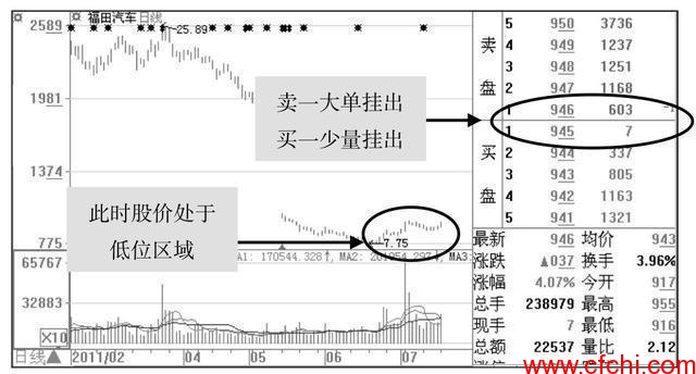 (1)主力在卖一档挂出大单,通常在500手以上,而在买一档上则挂上相对较小的买单,甚至有的主力在卖二、卖三、卖四、卖五都挂上大单,显示出盘中的抛压很大,以此来恐吓散户抛出手中的筹码,达到建仓的目的。例如某只股票在卖一9.46元处挂出603手的卖单,而在买一9.45元处挂上7手的买单,一旦盘中出现9.46元的卖单,就会马上被主力吃掉,依次不断地向上撤单。如果卖一处9.46元的卖单突然被撤掉,那么卖一处的价格就会变成9.47元,盘口上出现这种情况,是主力吃货建仓的明显特征(前提是股价不是处于被炒作后的高位),如图2-3所示。