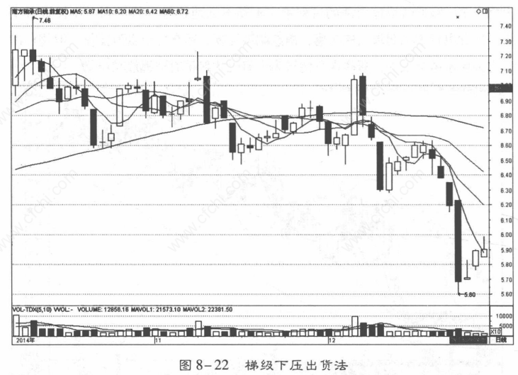 梯级下压出货法常见于小盘绩差类个股。打压出货以主力派发筹码为目的。从盘面上来看,虽然也是快速下跌,但盘中多有反弹,以吸引买盘跟进,同时稳定套牢者之持股信心。股价总体走势呈逐波下探之势,重心快速下移,在日K线上往往形成长阴线(图8-22)。