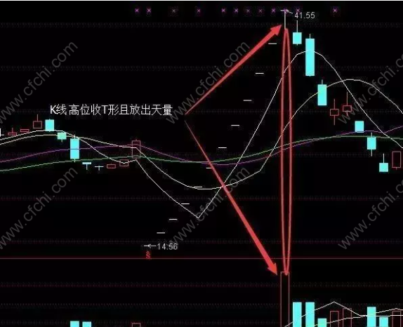 股价当天创出新高后,机构抛出一部分筹码,跟风投资者以为后市还会涨,买进的相对积极,不断接盘,尽管当天还是涨停报收,但是却收T形K线,成交量突破入出天量,这说明主力已经在盘中反复震荡出货,股价即将见顶回落了。这时候,投资者应当及时果断卖出。