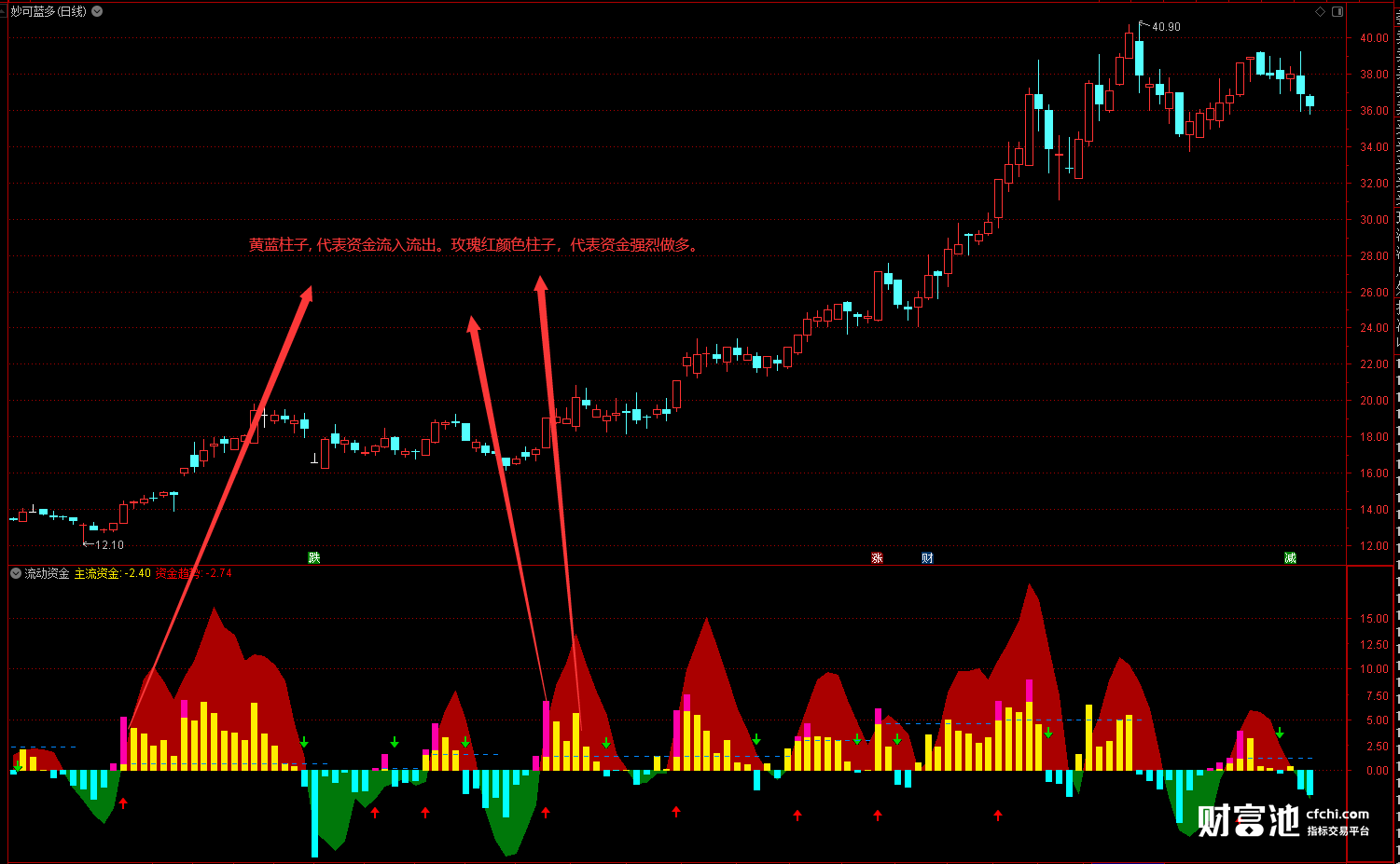 1、黄蓝柱子, 代表资金流入流出。玫瑰红颜色柱子,代表资金强烈做多。
