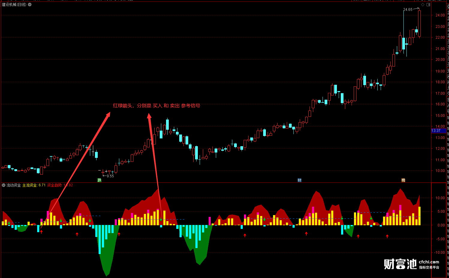 4、红绿箭头,分别是 买入 和 卖出 参考信号。红绿颜色区域,是资金趋势。红色代表流入占优,绿色是流出占优。
