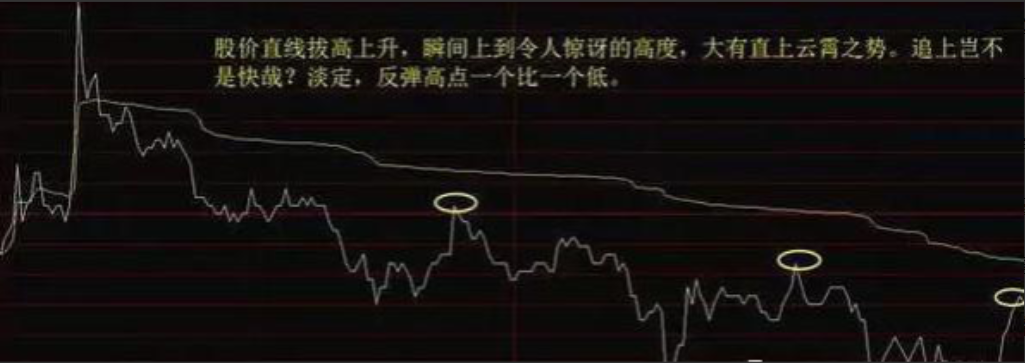 有的个股分时走势原处在跌势中,突然股价直线拔高上升,瞬间上窜到令人惊讶的高度,大有封板之势。主力制造出升高假象,就是为了吸引跟风盘以达到某种目的,走势疲惫谁去追捧?看到这种走势,有票可在高位择机派发,无票切不可追涨,股价冲高到一定高度肯定会落下,那时候在考虑要不要买进也不迟