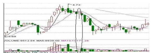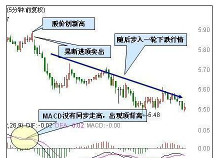 股价创新高时,MACD没有创新高,MACD出现顶背离。这说明短期趋势在走弱,主力资金在逐步撤离,一旦出货目的达到,股价很可能在当日反转向下,投资者应逢高减持,一旦股价反转则清仓出局。