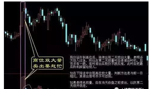 高位成交量巨大时K线形态:其一,K线长阴股价大跌,庄家出货意愿坚决;其二,K线长阳股价大涨,庄家强势拉高出货;其三,K线大阴大阳相吞,是较强烈的顶部信号。