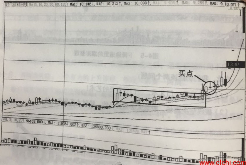 图4-6是时代新材的K线走势。该股经过漫长的横盘,继而箱体震荡,在突破箱体上沿后,经过短