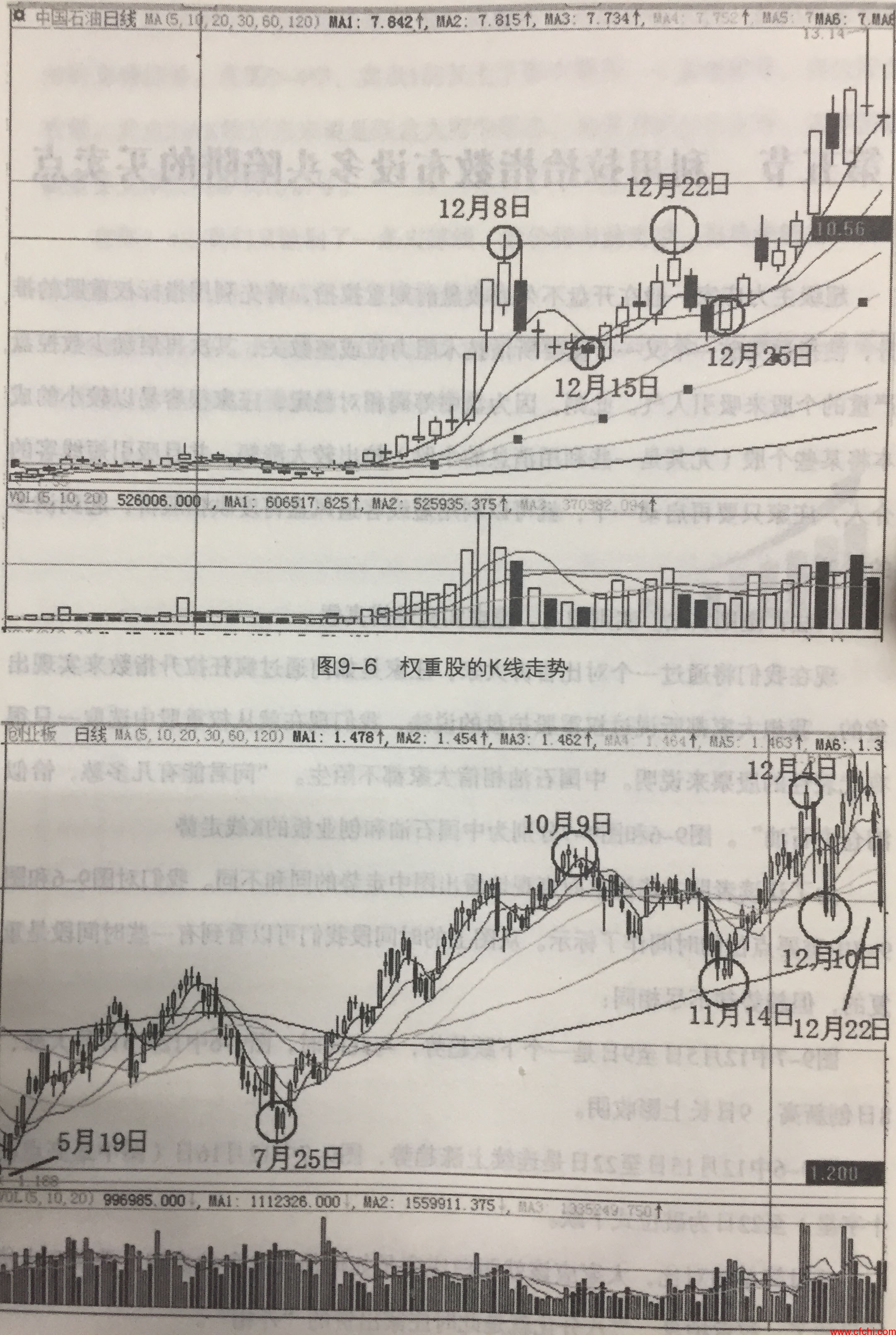 图9- .7中12月5日至9日是一个下跌趋势,与此同时,图9-6中12月5日号大涨、8日创新高、9日长,上影收阴。