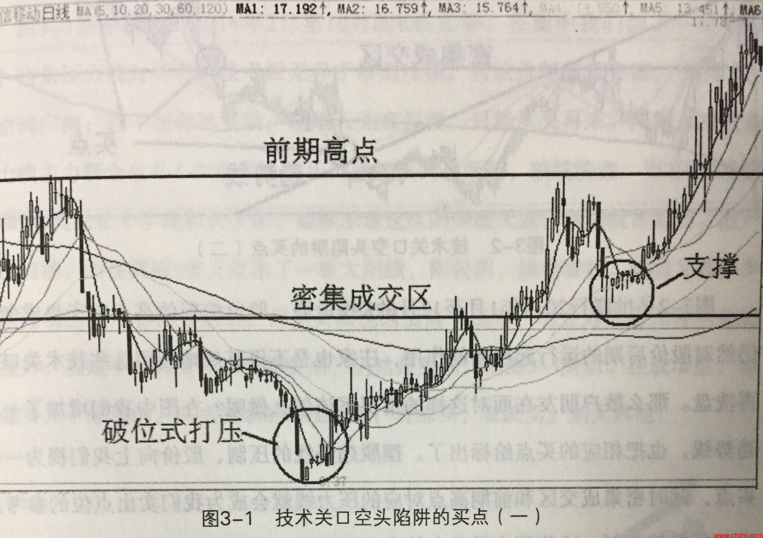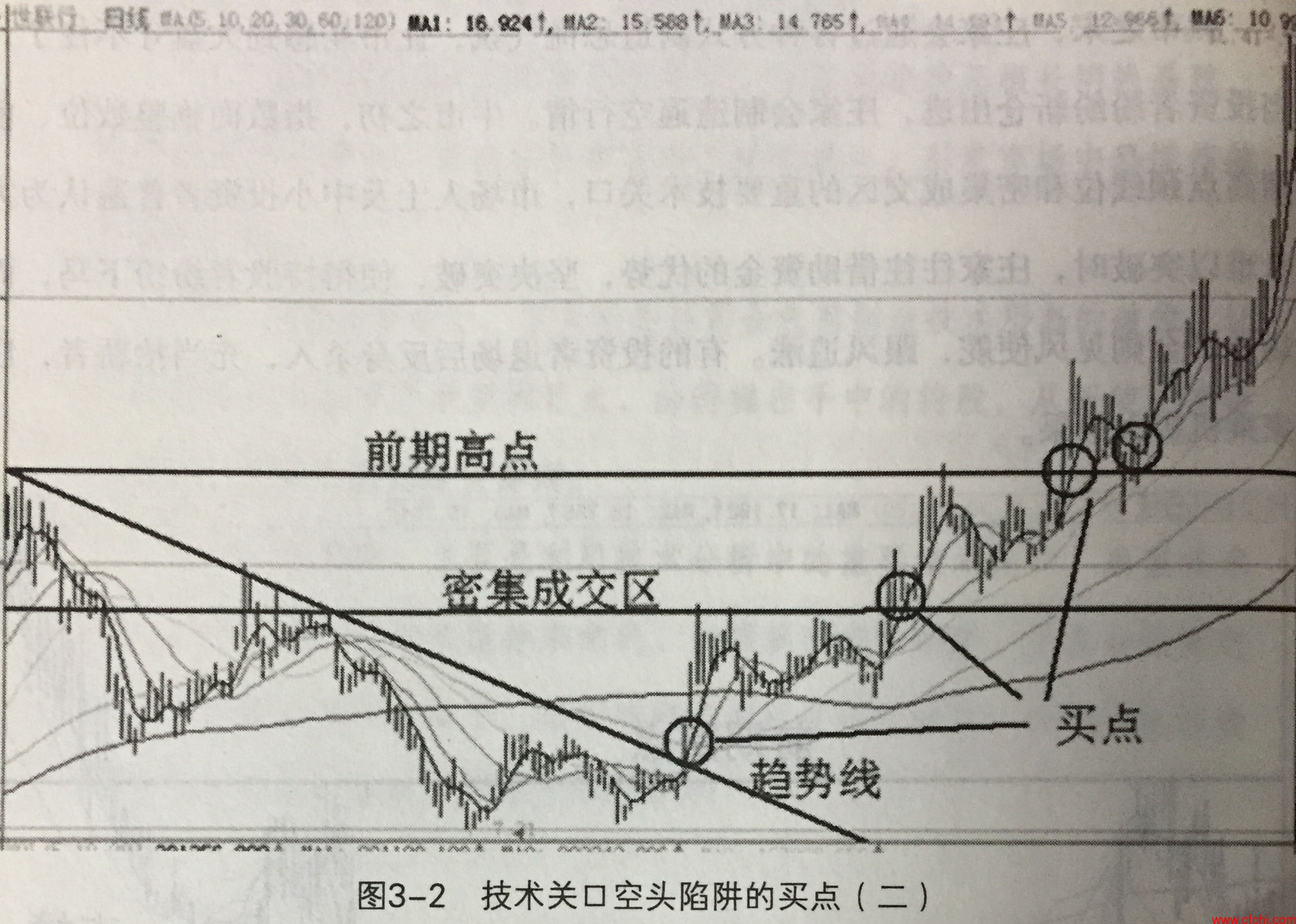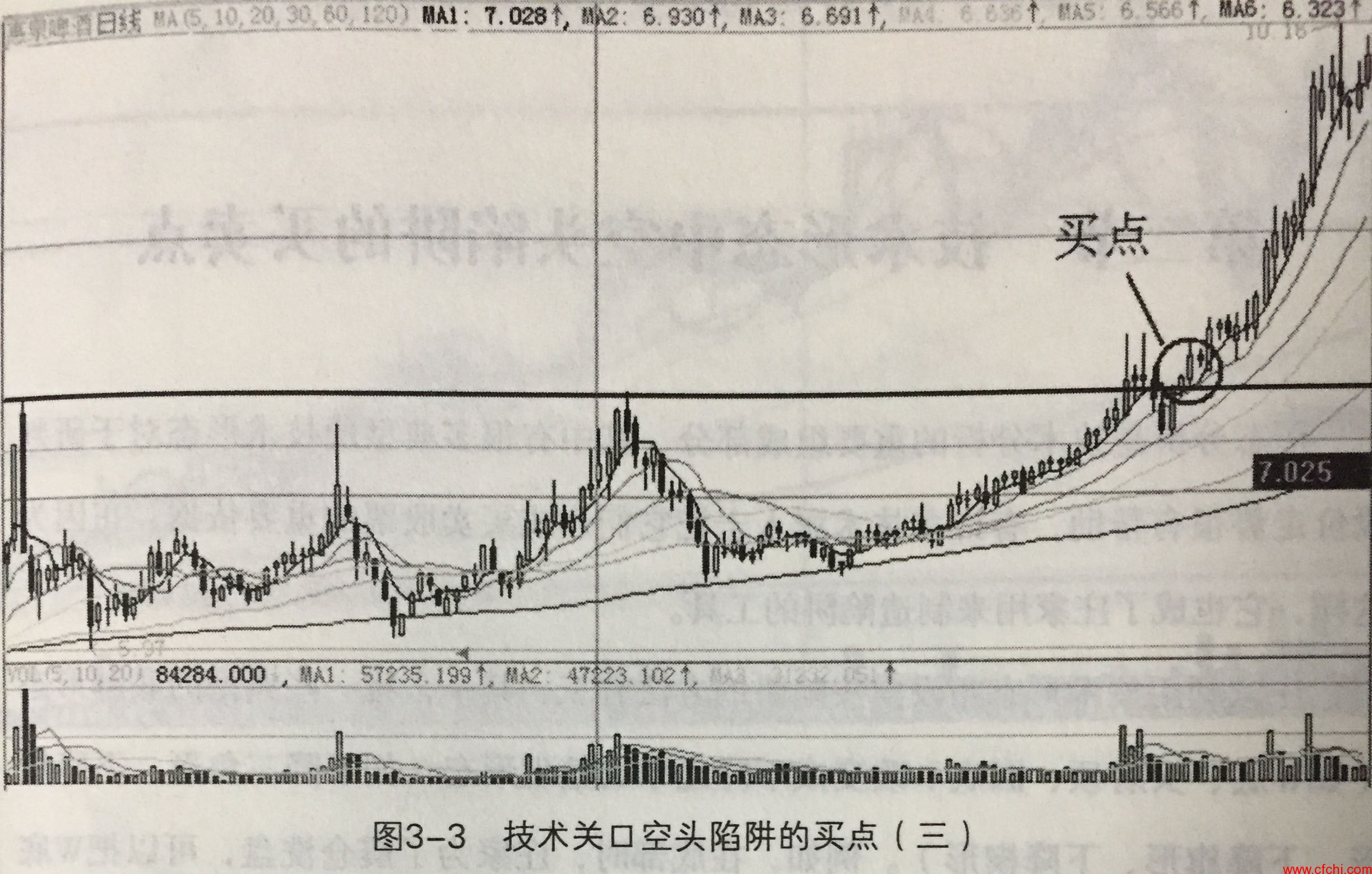 图3-1是恒信移动2014年1月至9月的K线走势。在图中我们可以看到庄家利用技术关口进行洗盘而布下的空头陷阱。首先,庄家利用一连串的大阴线破位式打压,手法凌厉而凶狠使小散户们短期出现巨大的损失而不得不割肉离场。这样做同时也为庄家的低位吸筹打开了空间。其次,在随后的股价运行中,庄家利用密集成交区、前期高点等重要的技术关口进行深度洗盘制造空头陷研。庄家的每次操作都是以大阴K线深度击穿均线为特征见。而密集成交区、前期高点都是非常重要的技术关口, 庄家利用这些技术关口的, 对散户的杀伤力可以想布置空头陷阱,洗盘也就不作为奇了。