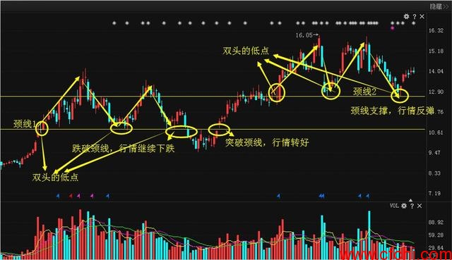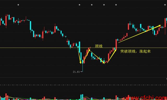 其实颈线就是支撑线或者压力线,相比一般的支撑压线而言,在K线走出双重顶/底、多重顶/底等形态时就会叫做颈线。颈线的画法以及作用都是一样的,连接形态的低点或者高点,大家看下面这两张图就行了。