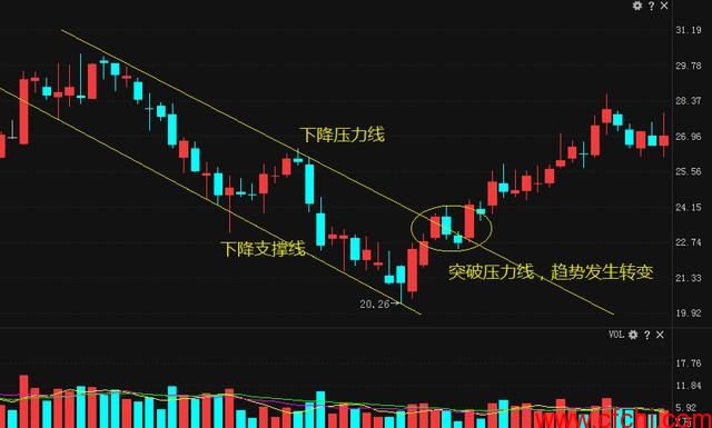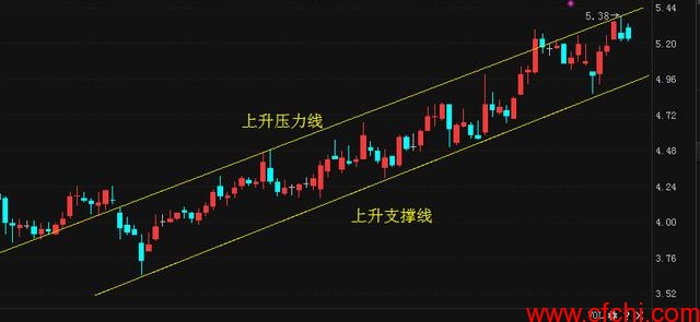 上升压力线也很容易理解,股价沿着趋势上升,每一次涨到一定高度的时候,就会回落。再继续在趋势区域中走波段行情,当股价突破上升压力线时,压力线就会转变成支撑线。同理,上升支撑线被跌破时,说明趋势就有发生改变的可能了,这是就需要注意。