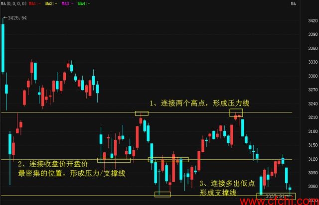 压力线和支撑线是可以相互转化的,就比如图中第二条线一样,选择了开盘价和收盘价非常密集的位置画线。因为这些密集区就是筹码集中的地方,不用说一定要选择那两点才能画线。