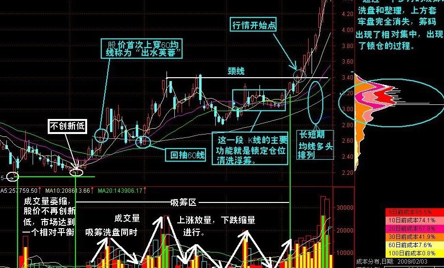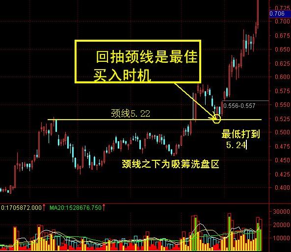 二、颈线的位置(狭义)。简而言之就是主力离开成本区的位置,在底部区域吸筹的个股可以认为颈线之下就是主力成本区。