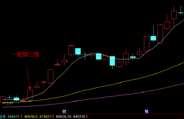 (2)出现大阳线或者是中阳线的时候,该阳线上穿5日、10日、30日三根均线,此时成交量放量,说明主力开始上攻行情。