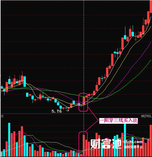 ②“一阳穿三线”的第二天,如果股价以缩量小阴线在前一天大阳线的实体里报收(阴孕线),尾市可视情加仓。如果第二天股价平开高走或高开高走,重仓出击。